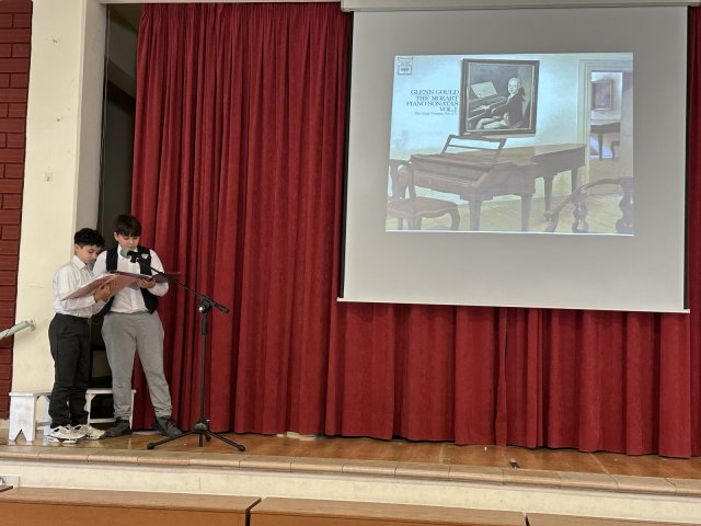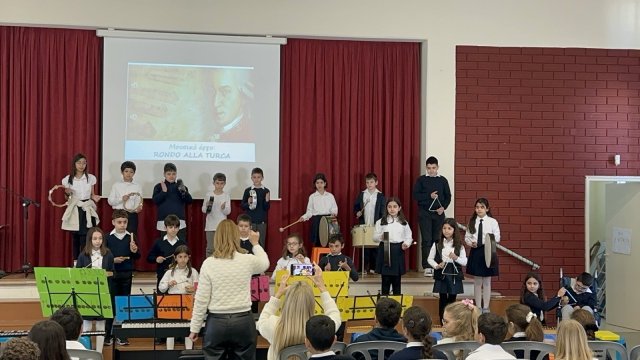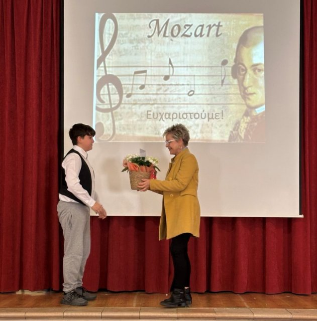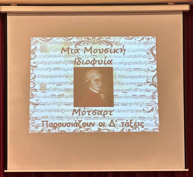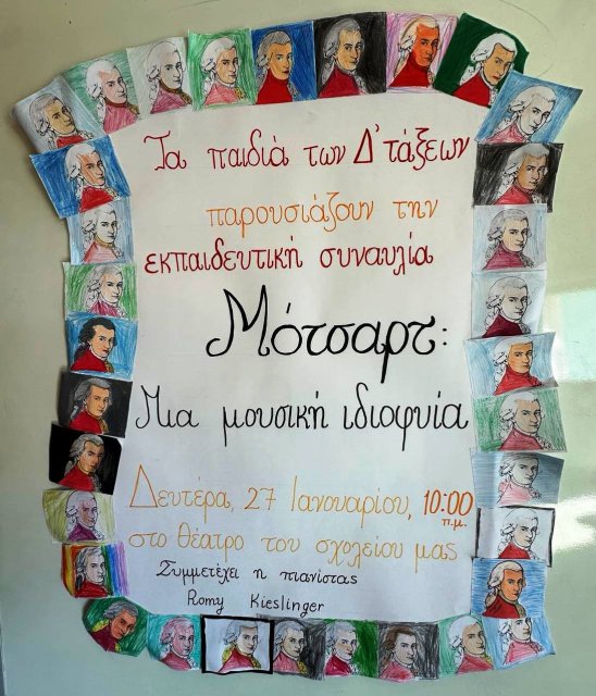 Τα παιδιά των Δ τάξεων του σχολείου , στα πλαίσια του μαθήματος της Μουσικής, παρουσίασαν τη Δευτέρα 27.01.2025, μια μικρή συναυλία με θέμα «Μότσαρτ: Μια μουσική ιδιοφυΐα». Η παρουσίαση έγινε προς τα υπόλοιπα παιδιά του σχολείου και πήρε εκπαιδευτική μορφή αφού τα παιδιά των Δ τάξεων έμαθαν, μέσω της παρουσίασής τους, στα παιδιά των Ε' & Στ' τάξεων για τη ζωή και το μουσικό έργο του διάσημου αυτού συνθέτη. Στη συναυλία συμμετείχε και η κ. Ρόμη Κιήσλινγκερ, η οποία είναι δασκάλα πιάνου και γιαγιά μαθήτριας του σχολείου .